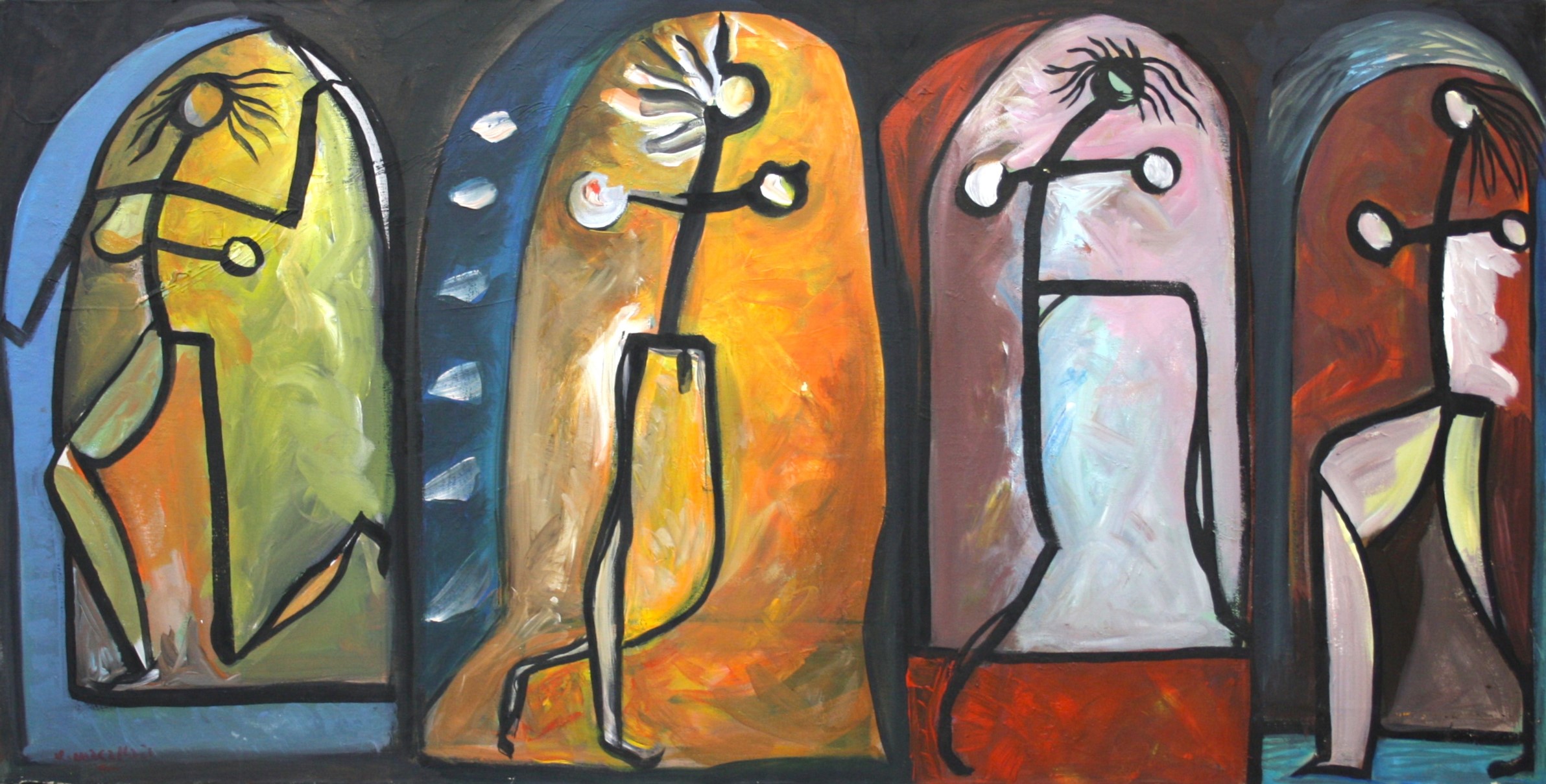 Se trata de obras de gran formato realizadas con espontaneidad, soltura y seguridad en el trazo, donde el artista consigue máximos expresivos con reducción de medios, con el conocimiento cromático y compositivo por el uso arbitrario del color y siempre utilizando el dibujo (figuras humanas), como metáforas de la condición humana.